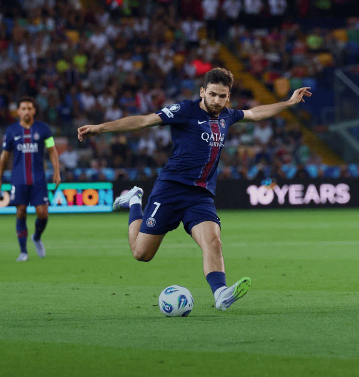 大巴黎欧超决赛最大的变数,就是没有让帮助球队夺得欧冠冠军的功勋门将多纳鲁马进入大名单,今夏花费4000万欧元引进的舍瓦利耶,在433的阵型中出任首发门将,门德斯、帕乔、马尔基尼奥斯和阿什拉夫构筑后防,杜埃、维蒂尼亚和埃梅里坐镇中场,巴尔科拉、登贝莱和克瓦拉茨赫利亚搭档进攻三叉戟。